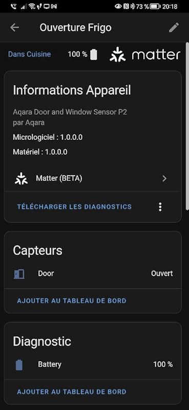 Il m’a fallu deux bonnes heures de tentatives infructueuses pour connecter ce capteur à Home Assistant (j’ai deux config indépendantes, avec deux adaptateurs matter, et deux thread border router, et accès depuis iPad et Android) — c’est beaucoup trop! Matter est censé simplifier les connexions et les rendre « universelles », là j’en suis très loin. J’ai déjà 5 périphériques Matter connectés à Google Home et Home Assistant, mais là j’ai bien galéré, sans comprendre pourquoi les 20 tentatives de connexion initiales ont échoué sur iPad et tablette Android…Premier problème, le code d’apairage Matter à 11 chiffres. La doc parle du code QR sur l’emballage ou le produit, mais il n’y a pas de code QR (à part un dans la doc pour télécharger une doc PDF, mais ça n’a rien à voir). Sur l’emballage il y a une étiquette code barre avec un beau symbole de clé… mais c’est un code alphanumérique de référence produit et n° de série, totalement inconnu des applications de connexion Matter. Finalement j’ai trouvé le code, imprimé en jet d’encre gris clair sur fond blanc sur la tranche du capteur! Un point réglé.Mais malgré ça, au moins 20 tentatives de connexion infructueuses en faisant varier l’installation, le client de connexion, le routeur thread, l’adaptateur Matter… Et mirâââââcle, au bout de deux heures, finalement j’arrive à ajouter le capteur à Home Assistant, qui fonctionne bien.Il est impératif que le border router Thread reste allumé pour pouvoir communiquer avec ce capteur, un Google Nest Hub 2 dans mon cas. Si on l’éteint, le capteur n’arrive pas à communiquer avec le dongle Matter directement, contrairement à d’autres périphériques (j’ai des prises Matter Meross et des ruban de LED Matter Aqara qui communiquent directement sans avoir besoin de border router Thread).Au total, c’est vraiment compliqué comme config et comme architecture. Peut-être que dans quelque temps j’aurai une infrastructure avec des Border Routers Thread qui couvre la maison, et à ce moment le support de périphériques nécessitant ça sera plus simple, mais ça n’est pas le cas aujourd’hui. Pour moi un capteur d’ouverture Zigbee (par exemple Sonoff SNZB-04) est considérablement plus simple à installer, fonctionne sans problème, pour un tiers du prix…Bref, en résumé, un capteur d’ouverture Matter ça marche, mais c’est compliqué à installer et ce modèle demande une infrastructure (border thread router) en plus de l’interface Matter, pas forcément disponible.