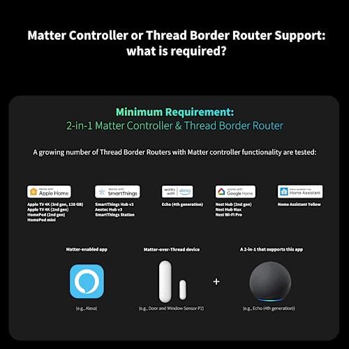 | Feature | [Compatibilité Matter] Un Contrôleur Matter et Routeur de bordure Thread 2-en-1 est nécessaire. Actuellement, les hubs suivants sont testés, mais de nouveaux hubs seront ajoutés au fil du temps. Apple: Apple TV 4K (3e génération, 128 Go), Apple TV 4K (2e génération), HomePod (2e génération), HomePod mini, Samsung : SmartThings Hub v3, Aeotec Hub v3, SmartThings Station, Amazone: Echo (4e génération), Google : Nest Hub (2e génération), Nest Hub Max, Nest Wi-Fi Pro. |
