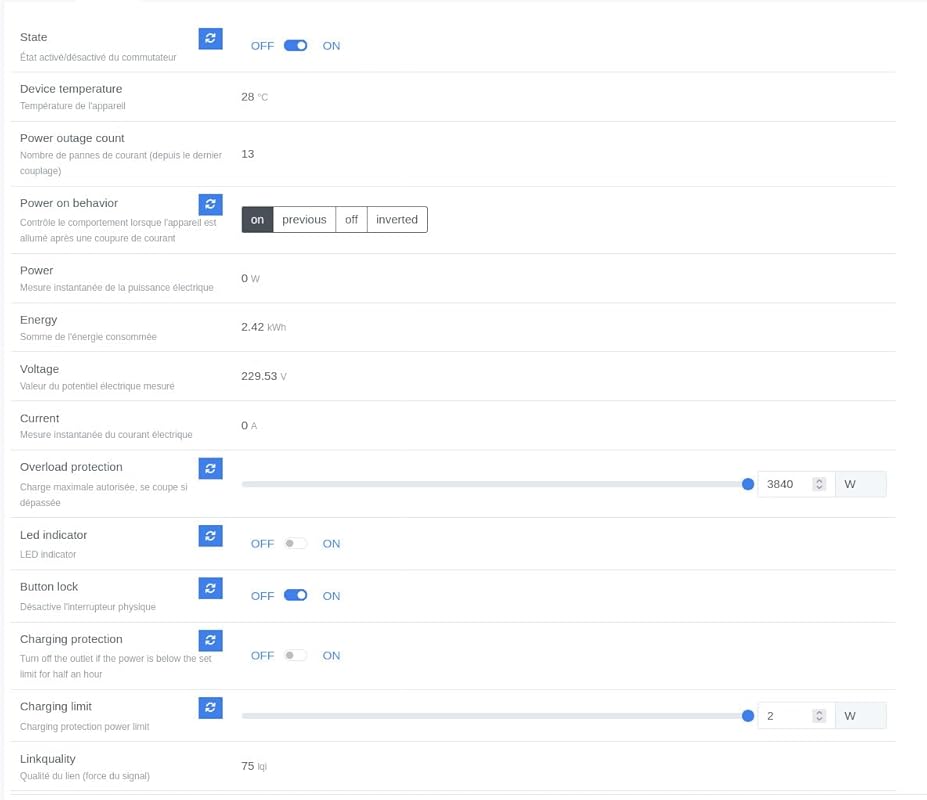 La prise fonctionne parfaitement et remonte beaucoup d’informations utiles, voir photo. Je n’ai eu aucun problème à l’apparier avec mon Home Assistant, zigbee2mqtt.Le seul point négatif, c’est qu’elle ne peut pas être insérée dans n’importe quel boîtier mural : la partie arrière est vraiment très grosse et ne passe pas dans les petites boîtes à encastrer, celles qu’on trouve en rénovation par exemple. Il faut prévoir très large pour que les fils puissent prendre leur place, arriver à l’arrière de la prise. Et justement, je trouve que les fils ne rentrent pas beaucoup dans la partie serrage, et ce serrage se fait avec des vis qui paraissent peu solides et qu’il faut visser très fort parce que les fils ont tendance à sortir un peu. La prise dépasse aussi beaucoup du mur, comparée à une prise ordinaire.Mais j’en suis quand même très content.
