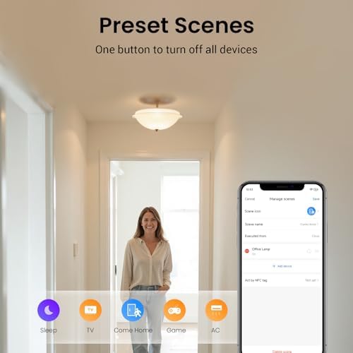 Interface de contrôle de la maison intelligente affichant la fonction « Scènes prédéfinies ». La capture d'écran de l'application affiche les icônes pour Sleep, TV, Come Home, Going et AC. Le texte se lit comme suit : « Scènes prédéfinies : un seul bouton pour éteindre tous les appareilsInterface de contrôle de la maison intelligente affichant la fonction « Scènes prédéfinies ». La capture d'écran de l'application affiche les icônes pour Sleep, TV, Come Home, Going et AC. Le texte se lit comme suit : « Scènes prédéfinies : un seul bouton pour éteindre tous les appareils