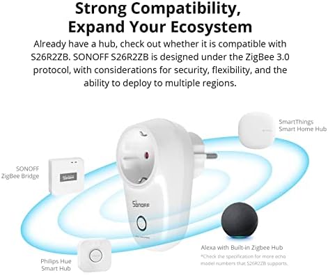 Nécessite le hub Zigbee : cette prise intelligente Zigbee S26R2ZB nécessite la connexion de la passerelle Zigbee pour l'utiliser, elle peut être connectée à SONOFF ZBBridge, SONOFF ZBBridge-P, SONOFF Zigbee Dongle Plus, Amazon, Samsung, Philips, appareils intelligents intégrés tels que SONOFF SONOFF 4ème génération.