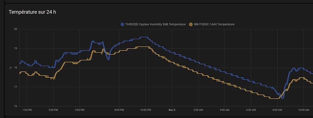 Ce petit capteur émet toutes les 6 minutes une information en Bluetooth pour vous transmettre le niveau de température et d’humidité.Il fonctionne avec une petite pile déjà inclus dans l’appareil qui est normalement prévu pour durer 3 ans. Il y a d’ailleurs le niveau de la pile qui est aussi transféré comme donnée.Ce qui est drôle c’est que j’ai reçu le colis et avant même de l’ouvrir j’ai pu voir une notification sous HA pour me dire qu’un nouveau capteur était présent alors que je n’avais pas encore ouvert la boîte.Donc autrement dit l’intégration sur résistante est absolument parfaite en quelques secondes.Là où j’ai plus de mal à comprendre c’est la complexité pour l’intégration sous l’interface Shelly. Le capteur apparaît bien dans l’interface mais il est marqué comme étant hors ligne.Après renseignement il faut en fait acheter un dongle spécifique qui permettra aux appareils Shelly de communiquer en Bluetooth. Il faudra l’alimenter sur du 220 volts en permanence grâce à un chargeur de téléphone par exemple.Je trouve ça complètement absurde qui fonctionne immédiatement avec Home Assistant mais n’est pas capable de fonctionner sous l’interface du constructeur sans ajout d’un autre élément alors qu’il apparaît quand même dans l’interface.❌ Le gros défaut de ce capteur est sa précision car il reste parfois bloqué sur certaines valeurs sans aucune explication. J’ai publié en photo de courbe comparé à un appareil concurrent et on peut bien voir que la courbe jaune reste avec une humidité bien supérieure en forme d’escalier alors que la courbe bleue de la concurrence respecte la mise en marche de la VMC et l’humidité descend immédiatement. Les deux courbes ont été pris au même moment et l’on peut voir que la température elle a été modifiée durant cette période aussi ce n’est donc pas un problème de communication avec le capteur mais bien le capteur qui ne renvoie pas les bonnes informations. La borne Home assistant est à 3m du capteur ici.Vous devez donc vous en servir avec l’idée d’une valeur approximative et ne pourra donc pas être utilisé pour la mise en place d’un ventilateur ou d’un chauffage par exemple.Je précise que les deux capteurs ont été placés exactement au même endroit, l’un derrière l’autre comme vous pouvez le voir sur les photos.