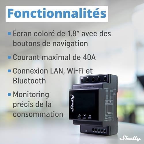 À propos de cet article Interrupteur connecté sur rail DIN – Conçu pour répondre à la norme mondiale du rail DIN, l’interrupteur Shelly Pro 4PM (4 canaux, 40 A total) se monte directement dans le tableau électrique pour répondre aux besoins d’automatisation de votre entreprise, commerce, usine ou autre bâtiment professionnel, administratif ou résidentiel Wi-Fi, LAN, Bluetooth – Pilotez votre interrupteur Shelly Pro 4PM à distance via Wi-Fi ou LAN pour une sécurité et une fiabilité améliorées ; *La connexion Bluetooth sert uniquement à des objectifs d’inclusion ou de passerelle Mesure de consommation d’énergie – Ce qui distingue Shelly Pro 4PM est notamment la possibilité de non seulement contrôler à distance votre éclirage et équipements, mais aussi d’obtenir un aperçu de la consommation d’énergie en temps réel Contrôle de 4 circtuis – Profitez de Shelly Pro 4PM pour contrôler indépendamment 4 circuits d’éclairage distincts, appareils éclectroménagers, vannes motorisées ou autres ; Créez des horaires ou des scènes intelligentes pour faire des économies d’énergie Commande vocale ou via App – L’app Shelly Smart Control vous aide à contrôler vos appareils et équipements électriques à distance, personnalisant vos automatisations à l’infini; Par ailleurs, ce dispositif permet encore un pilotage à travers plusieurs assistant vocaux et systèmes de Domotique, dont Alexa, Google et SmartThings