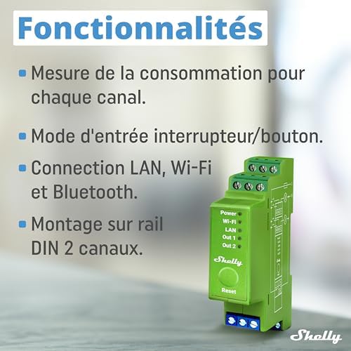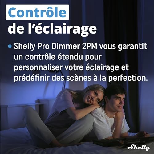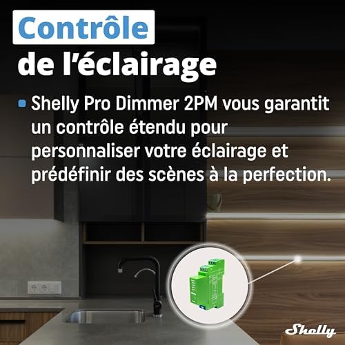 À propos de cet article Gradateur LED sans fil – Shelly Pro Dimmer 2PM est un variateur de lumière connecté (pour lumières LED, halogènes et transformateurs ferromagnétiques) qui est équipé de 2 canaux et d’une fonction de mesure de la consommation électrique Wi-Fi, LAN, Bluetooth – Gérez votre interrupteur Shelly Pro Dimmer 2PM à distance, via Wi-Fi ou LAN, pour une sécurité et une fiabilité améliorées ; *La connexion Bluetooth sert uniquement à des objectifs d’inclusion ou comme passerelle BLE Montage sur rail DIN – Shelly Pro Dimmer 2PM se monte directement sur le rail DIN de votre tableau éléctrique, tout en étant compatible avec les interrupteurs existants, qu’ils soient à un ou à deux boutons Luminosité personnalisable – Très adapté aux ambiances professionnelles, Shelly Pro Dimmer 2PM permet de régler les niveaux de luminosité minimum et maximum en fonction de vos préférences, des capacités de vos ampoules, ou même au rythme do soleil Consommation électrique optimisée – La possibilité de surveillance de l’énergie consommée en temps réel vous permet d’optimiser les coût opérationnels au sein de votre commerce ou business, histoire de faire des économies d’électricité Commande vocale ou via App – L’app Shelly Smart Control vous aide à contrôler vos appareils et équipements électriques à distance, personnalisant vos automatisations à l’infini; Par ailleurs, ce dispositif permet encore un pilotage à travers plusieurs assistant vocaux et systèmes de Domotique, dont Alexa, Google et SmartThings