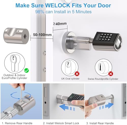 À propos de cet article Dimensions des cylindres: Diamètre des boutons : extérieur 44 mm / intérieur 38 mm ; longueur : extérieur 56 mm / intérieur 56 mm; Longueur du cylindre : réglable de 40 mm à 55 mm à l’extérieur et de 30 mm à 60 mm à l’intérieur;La distance entre le centre du trou de serrure et l’encadrement de la porte est supérieure ou égale à 40 mm;et convient à différentes épaisseurs de portes entre 50 et 100 mm Facile à installer et à changer les batteries: Remplacez uniquement le cylindre de la serrure sans changer le corps de la serrure d’origine, finissez l’installation par vous-même sans percer en 5 minutes. Il est alimenté par 3 piles AAA. Veuillez noter que la pile n’est pas incluse dans l’emballage Méthodes de déverrouillage pratiques: Ouverture de la porte avec un mot de passe, une carte RFID ou une application. Stockage jusqu’à 10 groupes de mots de passe (dont 3 avec fonction admin). Jusqu’à 20 cartes peuvent être jumelées. serrure à code avec mot de passe temporaire. Des applications pour iOS et Android sont disponibles. Avec l’application, vous pouvez ouvrir/verrouiller le cylindre de porte ou faire des réglages et des autorisations Contrôle WiFi: Déverrouillage de la serrure à distance via le smartphone, contrôlez la serrure connectee we lock à partir de l’application, où que vous soyez et à tout moment.Record Query, vous saurez toujours qui ouvre votre porte et quand.La fonction WiFi nécessite le pont WiFi.Veuillez noter que la passerelle doit être achetée séparément Garantie Serrure Connectée WELOCK: Si vous avez des questions sur l’installation, le fonctionnement, etc., n’hésitez pas à nous contacter